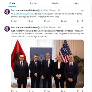 “Reforma në drejtësi është thelbësore për Shqipërinë dhe përpjekjet e saj për integrim në BE. U takova me drejtuesit e reformës në drejtësi në Tiranë për të përgëzuar progresin e tyre në avancimin e shtetit të së drejtës dhe luftimin e korrupsionit”, shkroi sekretari Blinken në X.