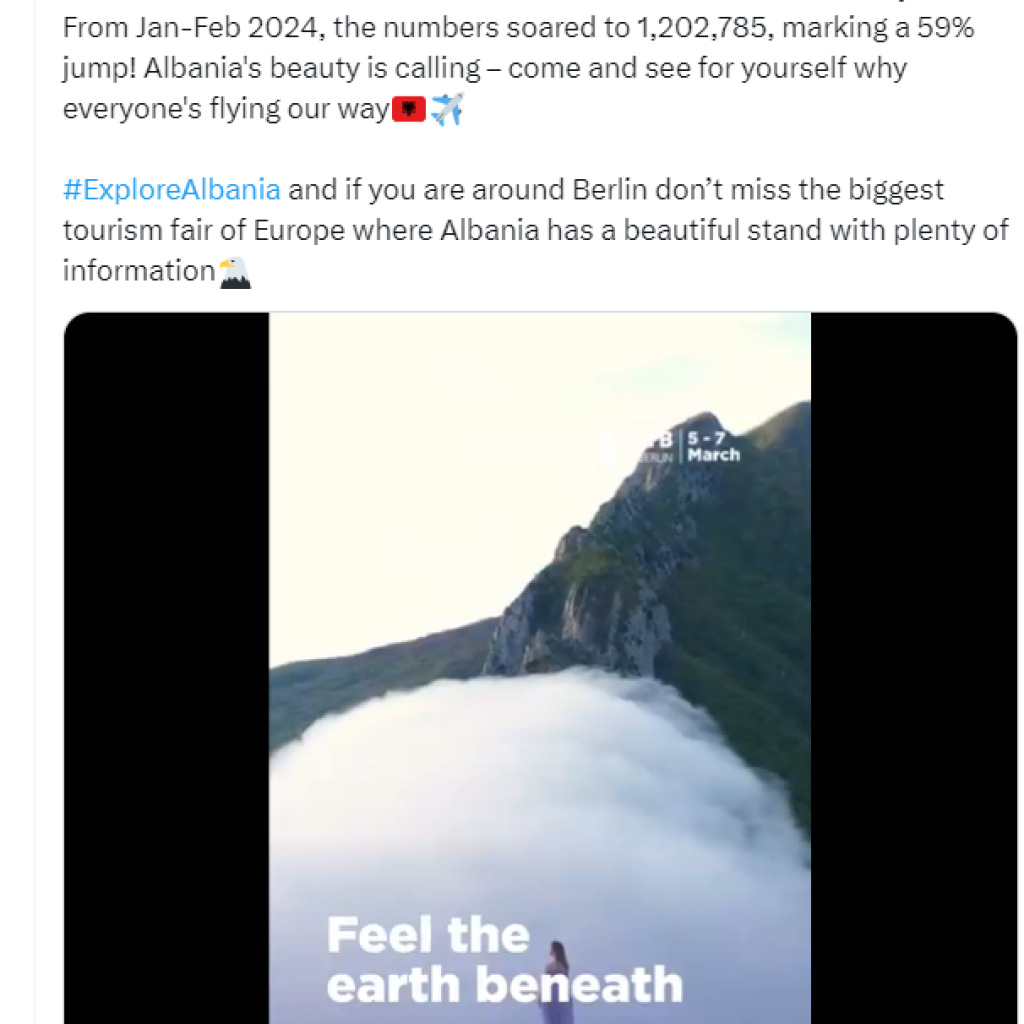 “Aeroporti Ndërkombëtar i Tiranës është në një rrugë të pabesueshme fluturimi! në shkurt 2024, ne mirëpritëm 577,515 udhëtarë, një rritje prej 69% nga viti i kaluar. nga janari deri në shkurt 2024, shifrat u rritën në 1,202,785, duke shënuar një kërcim 59%! bukuria e shqipërisë po thërret – ejani dhe shikoni vetë pse të gjithë po fluturojnë në rrugën tonë #explorealbania dhe nëse jeni përreth berlinit, mos humbisni panairin më të madh të turizmit në evropë, ku shqipëria ka një stendë të bukur me shumë informacion”, ka shkruar kryeministri.