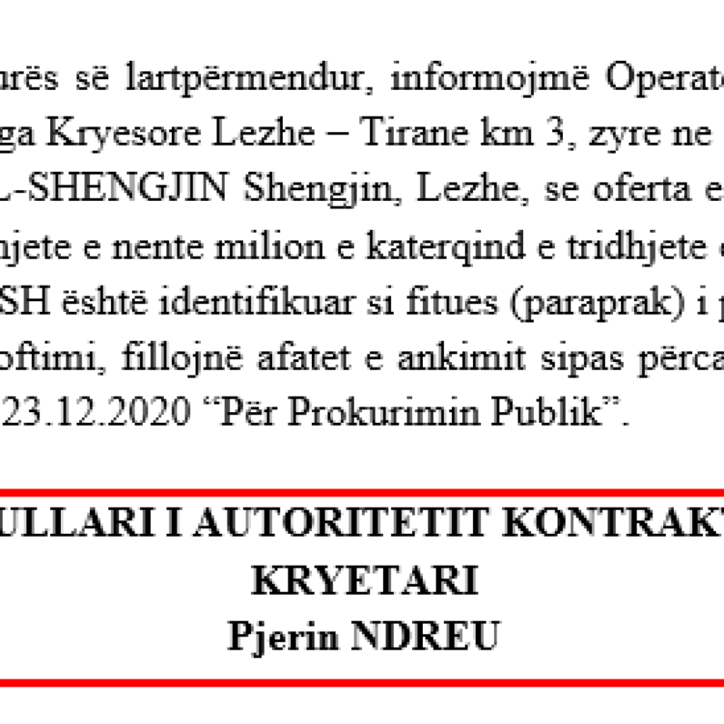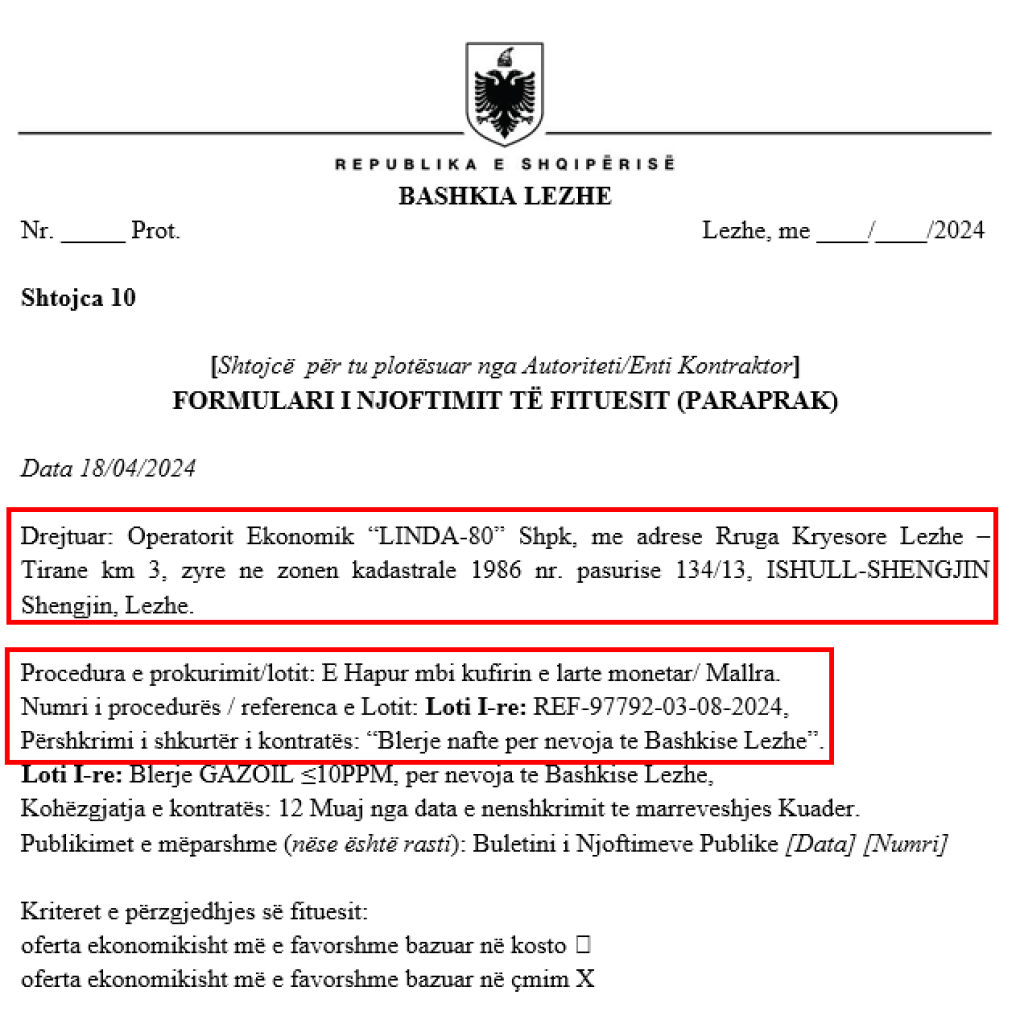 Problemi qëndron se tenderi ka patur si pjesëmarrës të vetëm fituesin e tij. Pra kemi të bëjmë me një procedurë pa garë, në mungesë totale të konkurrencës. Bëhet fjalë për tenderin me numër reference REF-97792-03-08-2024 që ka si objekt “Blerje GAZOIL =10PPM, për nevoja të Bashkisë Lezhë”.