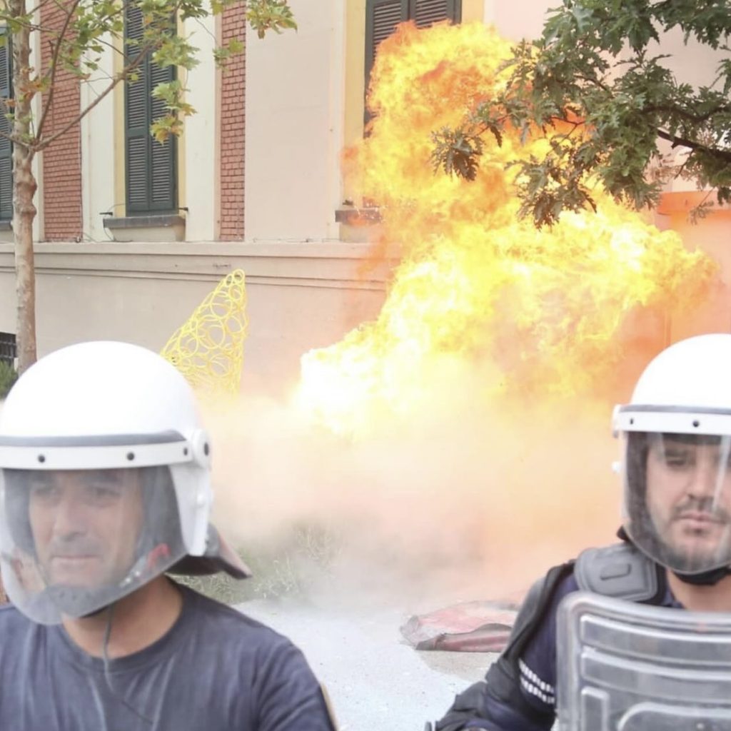Gjatë fjalës së tij në protestën para Bashkisë Tiranë, Belind Këlliçi i ka vënë prangat një personi i cili mbante një maskë në fytyrë me pamjen e kryebashkiakut Erjon veliaj.