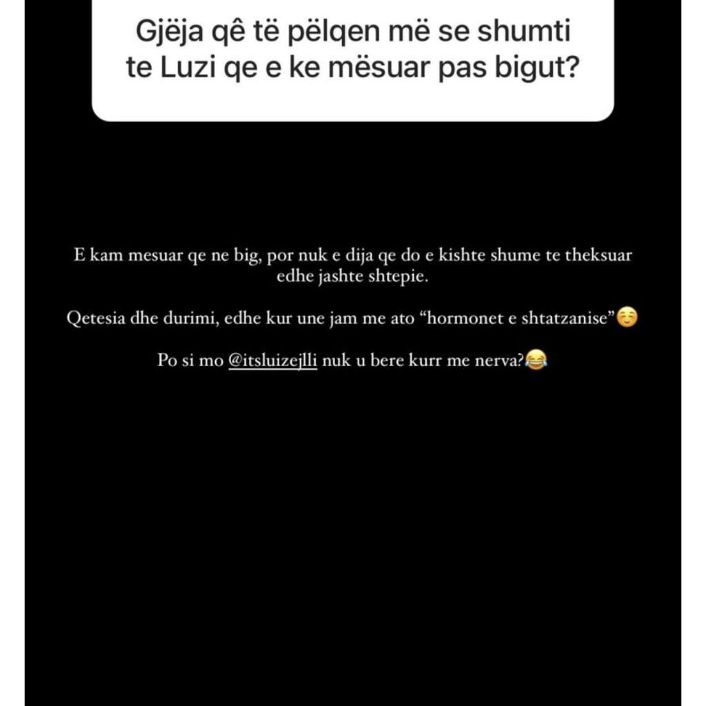 ‘E kam mësuar që në Big por nuk e dija që do e kishte kaq shumë të theksuar dhe jashtë shtëpie. Qetësia dhe durimi, dhe kur unë jam me ‘hormonet e shtatëzanisë’. Po si mo Luiz nuk u bëre njëher me nerva?’- shkruan Kiara.
