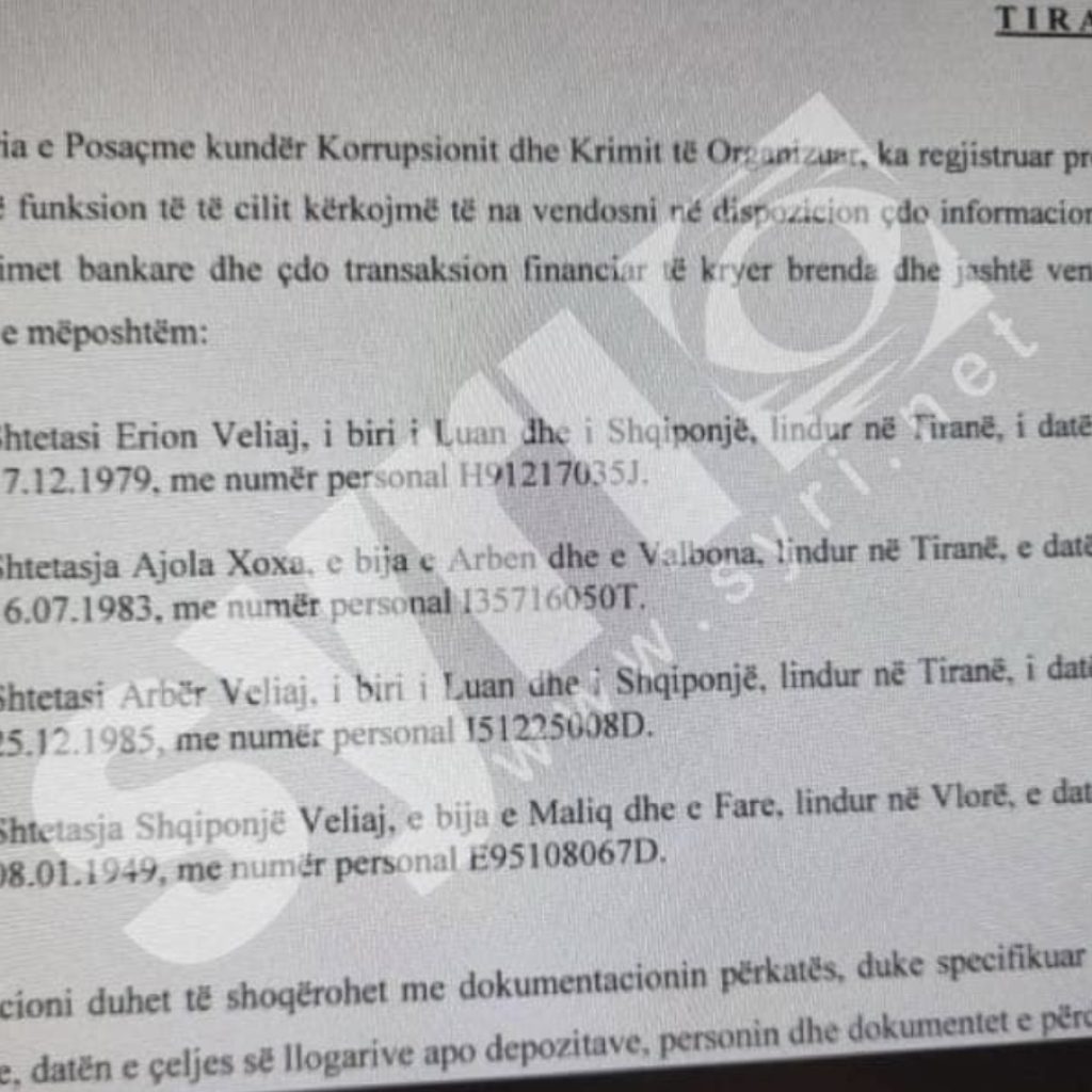 Informacioni i kërkuar nga SPAK për kryetarin e Bashkisë përfshin edhe familjarët e tij, bashkëshorten Ajola Xoxa, vëllain Arbër Veliaj dhe mamaja Shqiponjë Veliaj.